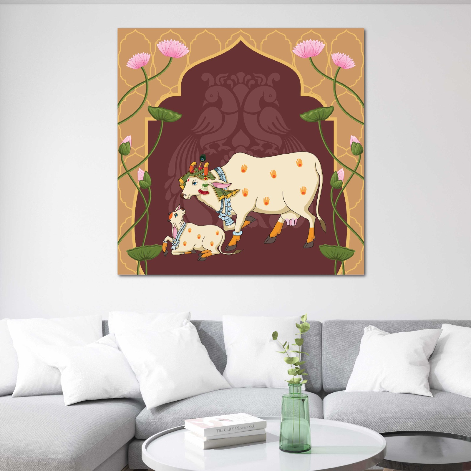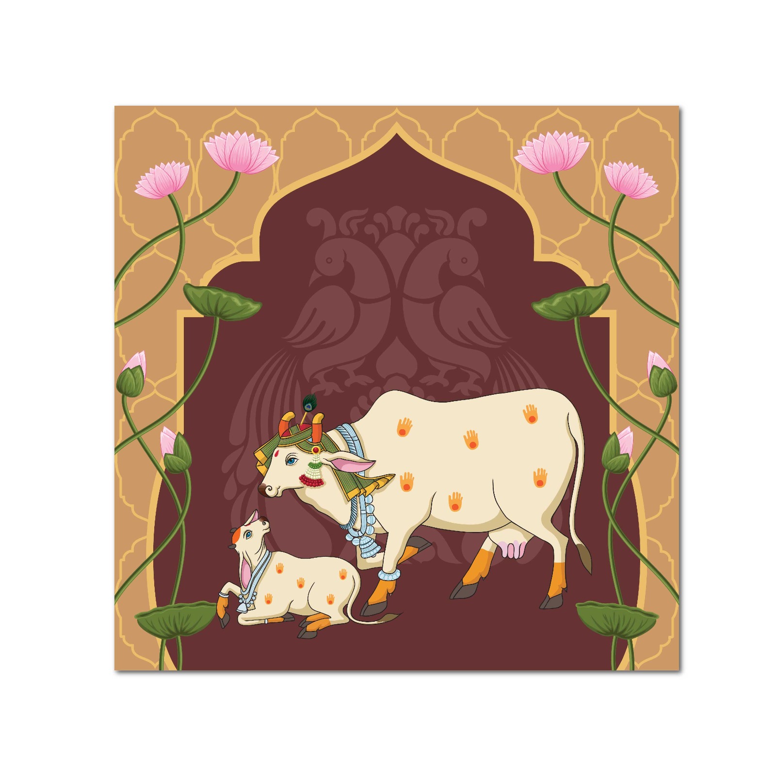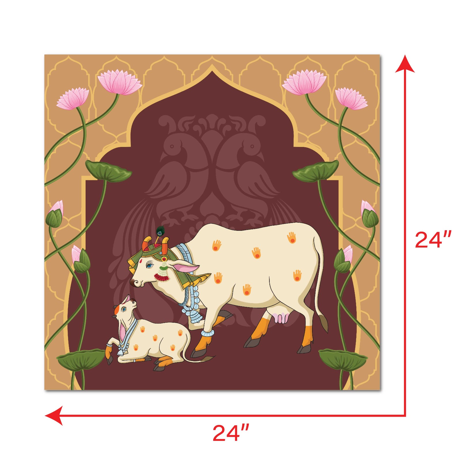 Celebrate traditional Indian art with the Indian Rajasthani cow rectangle wall art. Inspired by the rich culture of Rajasthan, this decor showcases detailed miniature artwork of sacred cows in a Pichwai style. Add the Indian Rajasthani cow rectangle wall art to your home to bring in cultural depth and spiritual elegance.